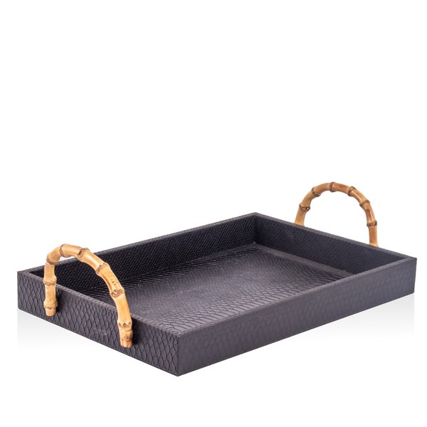 Bandeja Couro Texturizado Preto e Alça de Bambu G