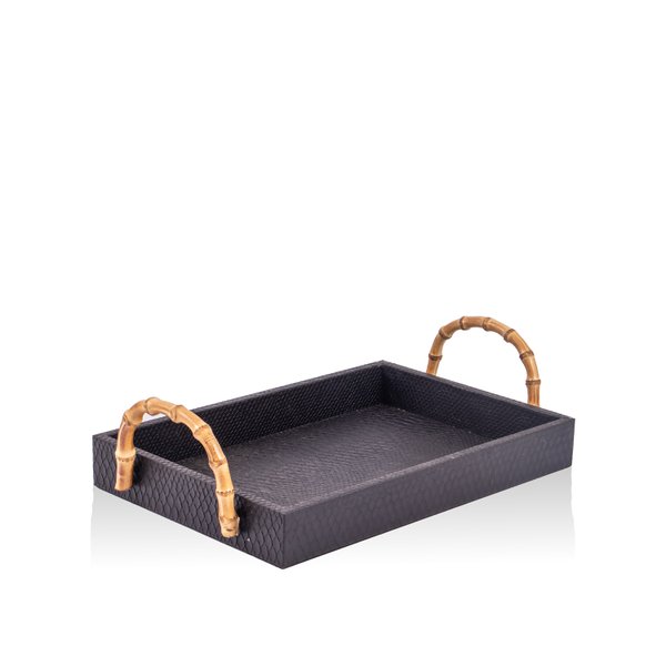 Bandeja Couro Texturizado Preto e Alça de Bambu P