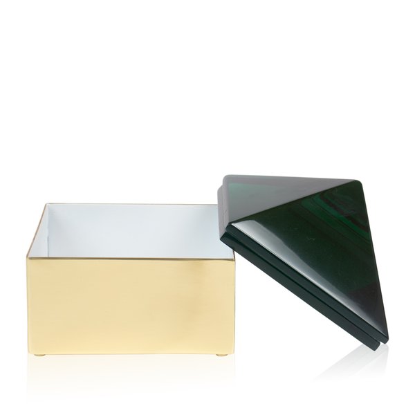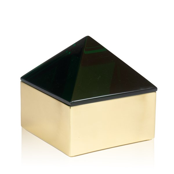 Esta deslumbrante caixa decorativa combina o requinte do metal dourado com a beleza da tampa em formato de pirâmide confeccionada em resina verde.