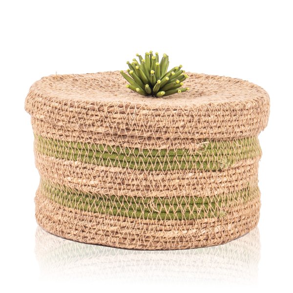 Adicione um toque de charme e funcionalidade ao seu espaço com a encantadora Caixa Decorativa Redonda em Palha, realçada por elegante detalhe na cor verde.