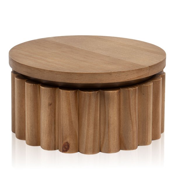 Transforme a organização e a decoração do seu espaço com a Caixa Redonda em Madeira Torneada Caramelo, uma peça que une funcionalidade, elegância e design artesanal em um único objeto.