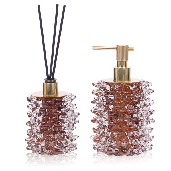 Adicione um toque de requinte e beleza com o Conjunto de Saboneteira e Difusor Murano Âmbar, e eleve o seu espaço de maneira única e estilosa.