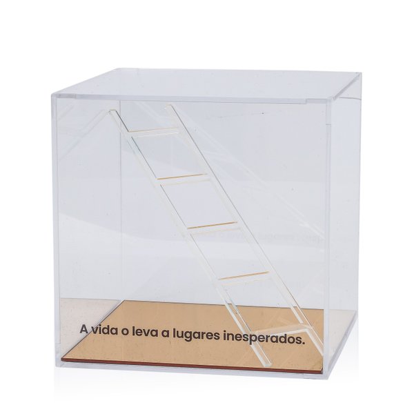 Dê um toque contemporâneo e simbólico à sua decoração com o Cubo Acrílico com Escada Transparente.