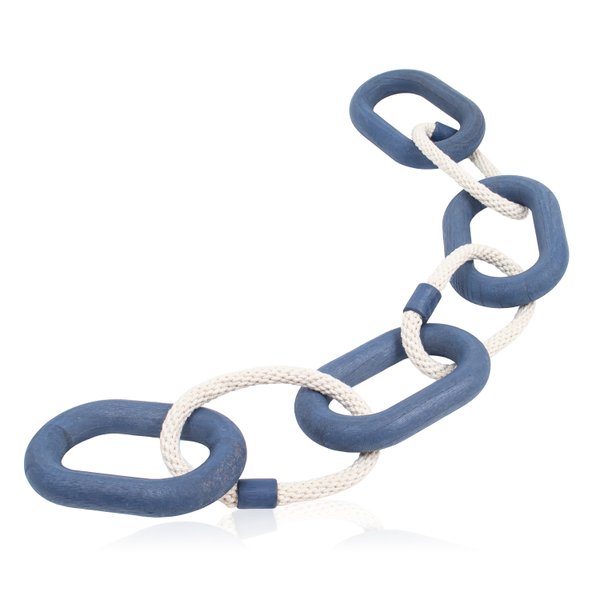 Composto por 7 elos interligados, o design traz equilíbrio entre a rusticidade da madeira natural e a delicadeza do crochê em tom azul, criando uma peça única e cheia de personalidade.
