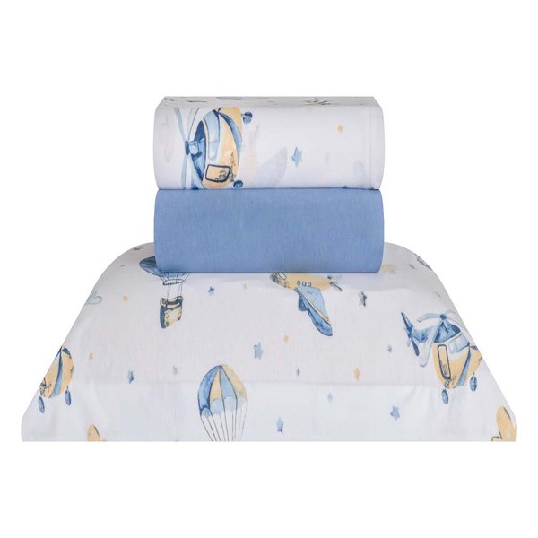Com uma estampa encantadora que captura a magia de voar entre nuvens e estrelas, seja de balão ou avião, este conjunto traz aventura e sonhos ao quarto infantil.