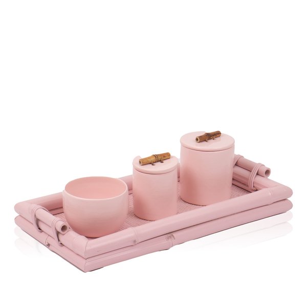 Refine a decoração do seu banheiro com este elegante Kit Decorativo, composto por uma bandeja em bambu natural na cor rosa e porta objetos em cerâmica rosa claro com acabamento em bambu.