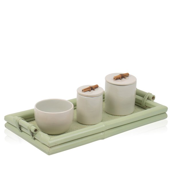 Refine a decoração do seu banheiro com este elegante Kit Decorativo, composto por uma bandeja em bambu natural na cor verde e porta objetos em cerâmica bege claro com acabamento em bambu.