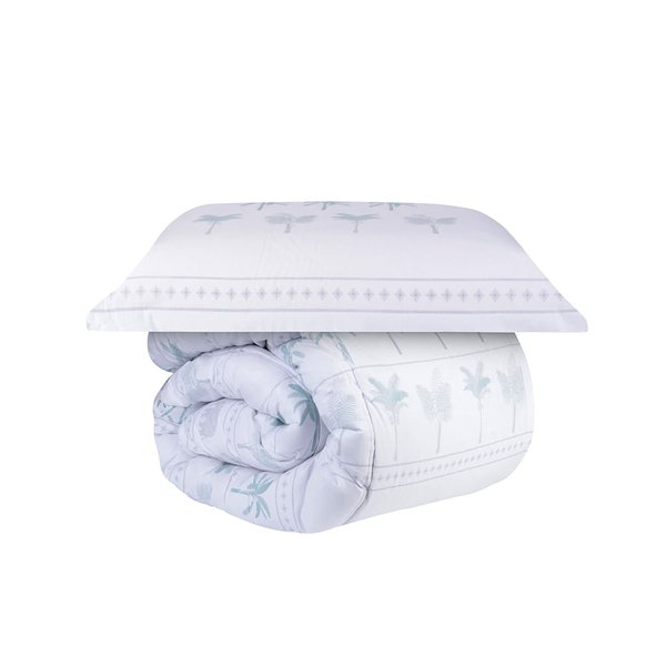 Este comforter apresenta uma estampa rica e detalhada, incorporando símbolos da natureza como coqueiros e elefantes, em harmoniosos tons de verde e cinza.