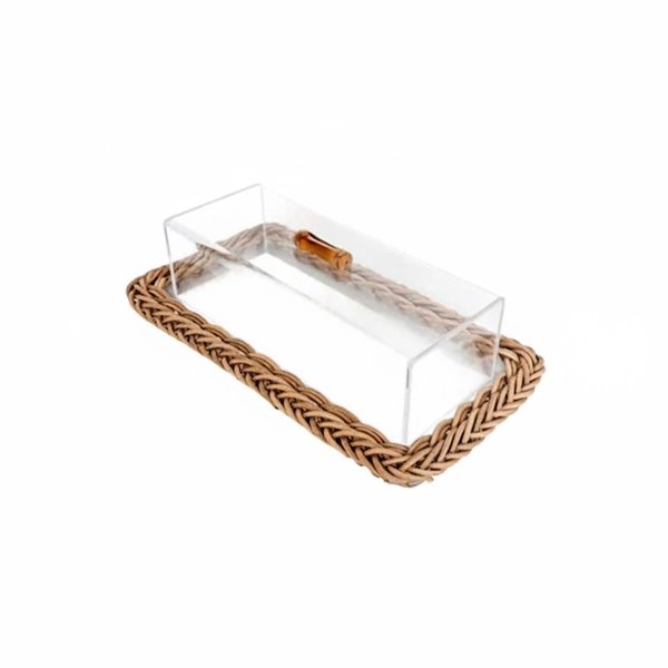 A combinação do acrílico transparente, que valoriza a apresentação do alimento, com a base em fibra sintética tipo cestaria na cor caramelo, traz aconchego e elegância atemporal.