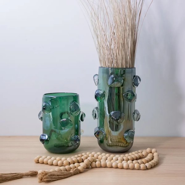 Acrescente charme e elegância à sua decoração com o Par de Vasos em Vidro Verde Metalizado.