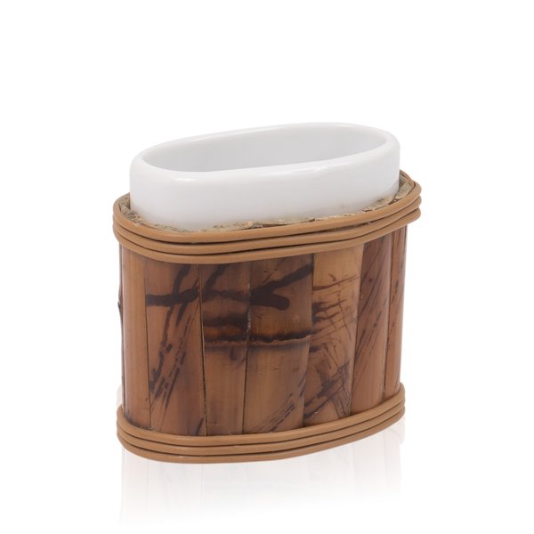 Mantenha seu banheiro organizado e elegante com o Porta Escova e Objetos em cerâmica, revestido com bambu natural.