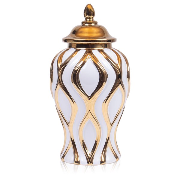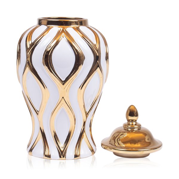 Adicione elegância e sofisticação aos seus ambientes com o Potiche Decorativo em Cerâmica com Tampa nas cores Branco e Dourado.