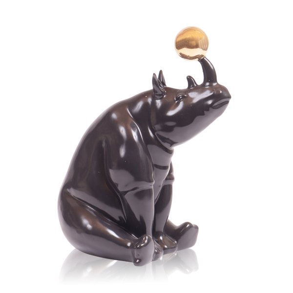 A presença marcante da escultura é enriquecida pela bola dourada na ponta do chifre do rinoceronte, um detalhe que invoca a ideia de conquista suprema, ideal para inspirar determinação e sucesso.
