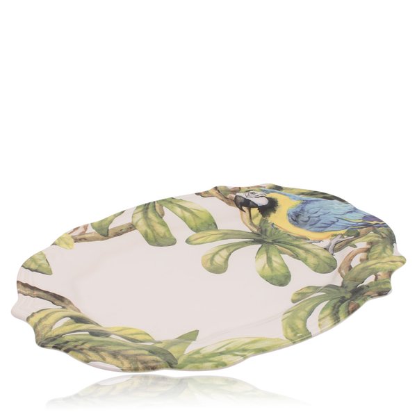 - Design digital exclusivo: Estampa vibrante com folhas verdes e uma arara colorida no canto, inspirada no exuberante universo da flora e fauna tropicais.