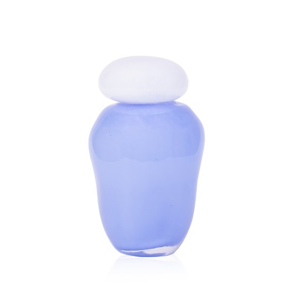 O contraste entre o vidro azul translúcido e a tampa branca adiciona um toque de modernidade e charme ao ambiente, tornando este vaso uma escolha versátil para residências, escritórios ou espaços corporativos de todos os estilos.