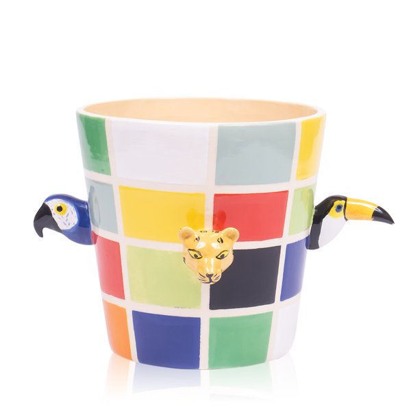 Seu design exclusivo é inspirado na fauna brasileira, apresentando cores vibrantes e detalhes marcantes, tornando o vaso uma escolha perfeita tanto para decoração quanto como porta-objetos versátil e prático.