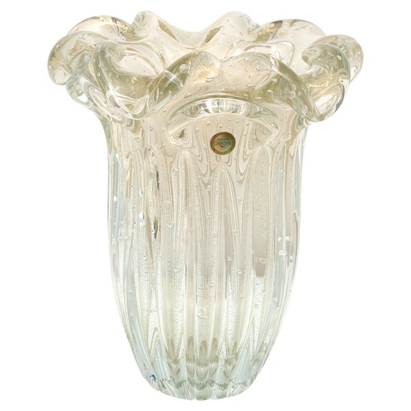 Artesanalmente produzido em murano transparente e um toque exclusivo de pó de ouro, este vaso é mais do que um simples objeto decorativo; é uma declaração de estilo e elegância.